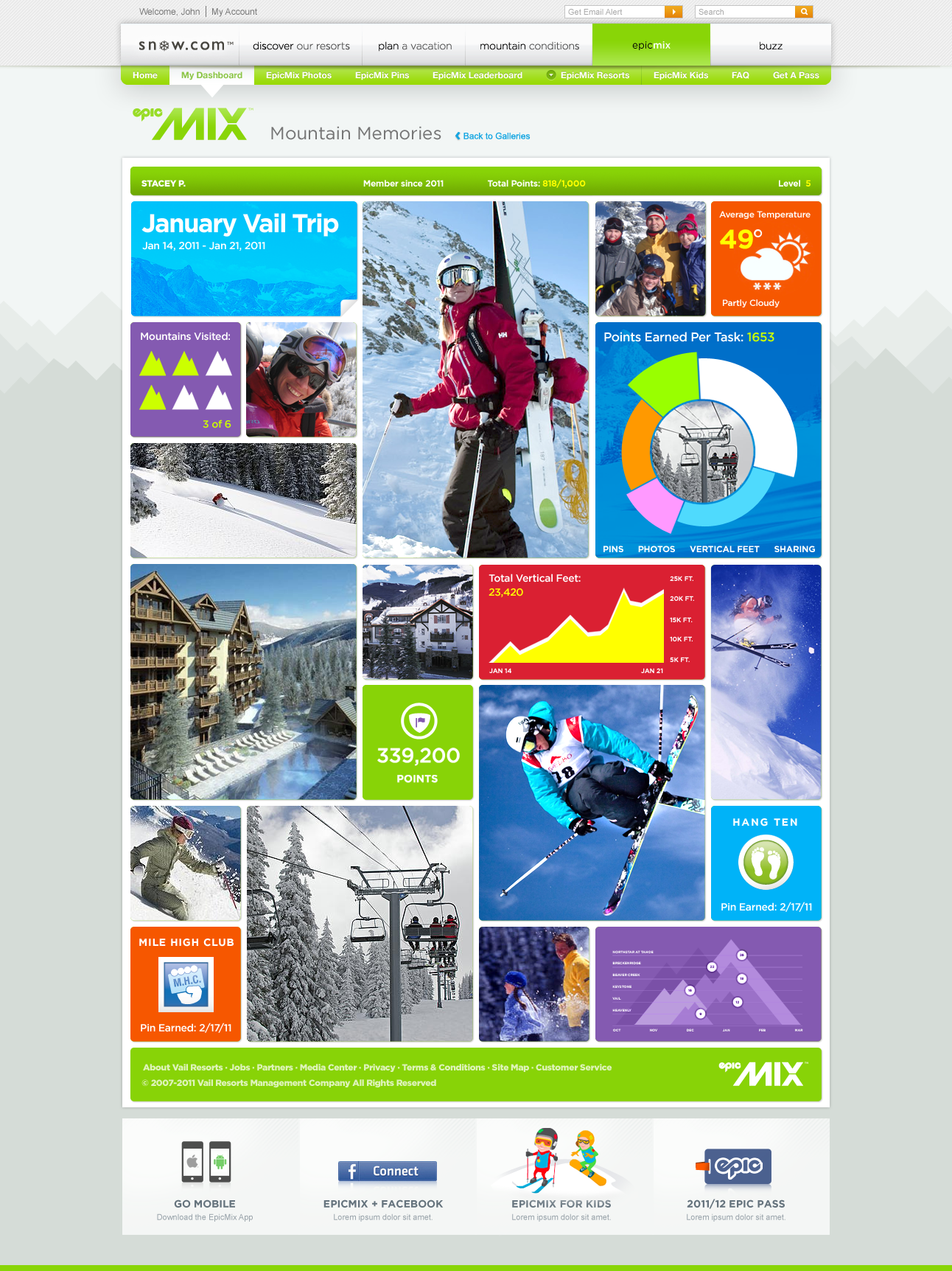 The Mountain Remix collage allows guests to combine their on-mountain EpicMix professional photos with their stats, such as days skied and vertical feet with their favorite digital pins they’ve earned, along with other selected information like snow totals, into a single picture file or “jpeg” creating a completely one-of-a-kind Remix collage. The Remix will be a single snapshot of their perfect day, vacation or season that guests can then share on Facebook and Twitter with friends and family.